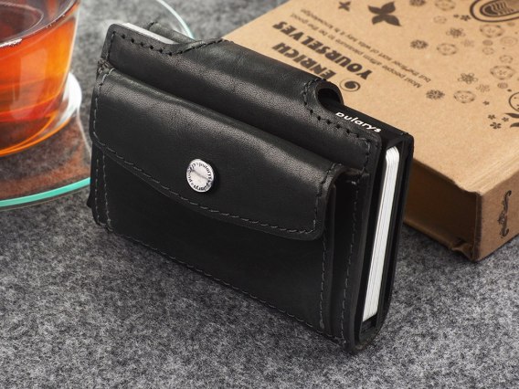 Ten portfel wykonany jest ze skóry naturalnej z aluminiowym etui na karty płatnicze oraz mechanizmem wysuwania kart. Produkt został zaprojektowany z myślą o codziennym użytkowaniu, jednak zawiera elementy, które wymagają zachowania ostrożności.