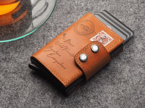 Ten portfel wykonany jest ze skóry naturalnej z aluminiowym etui na karty płatnicze oraz mechanizmem wysuwania kart. Produkt został zaprojektowany z myślą o codziennym użytkowaniu, jednak zawiera elementy, które wymagają zachowania ostrożności.