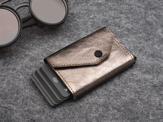 Wewnątrz kieszonka na dokumenty lub wizytówki oraz dodatkowa kieszonka na monety, zamykana klapką. Banknoty przechowasz w unikalnej przegródce wykonanej w całości z papieru Wash Paper. Specjalny mechanizm stopniowego wysuwania kart, zapewnia do nich szybki i łatwy dostęp. Dzięki zastosowanej w konstrukcji portfela technologii blokowania RFID, Twoje wrażliwe dane oraz środki na kartach płatniczych są całkowicie bezpieczne i chronione przed nieautoryzowanym skanowaniem lub kradzieżą.
