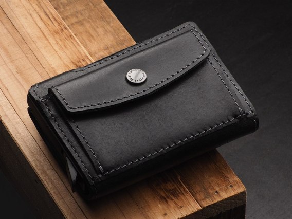 Ten portfel wykonany jest ze skóry naturalnej z aluminiowym etui na karty płatnicze oraz mechanizmem wysuwania kart. Produkt został zaprojektowany z myślą o codziennym użytkowaniu, jednak zawiera elementy, które wymagają zachowania ostrożności.
